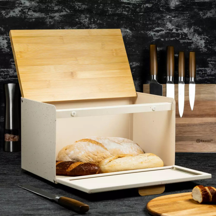 Czy widziałeś już nasz wyjątkowy chlebak, który powstał z niezwykłego połączenia drewna i stali? Solidny, metalowy chlebak daje Ci możliwość przechowywania pieczywa, na dłużej podtrzymując jego świeżość. Pokrywy wykonane z metalu oraz drewna bambusowego posiadają możliwość dwustronnego otwierania, co świadczy o niezwykłej funkcjonalności chlebaka. Chlebak nie zajmie dużej ilości miejsca w Twojej kuchni. Nowoczesne rozwiązanie z wykorzystaniem dwóch ruchomych pokryw sprawia, że budzi on zainteresowanie tysięcy naszych klientów. Postaw na jakość i styl, zdecyduj się na chlebak Klausberg KB 7465, by każdego dnia cieszyć się świeżością pieczywa i wygodą użytkowania!