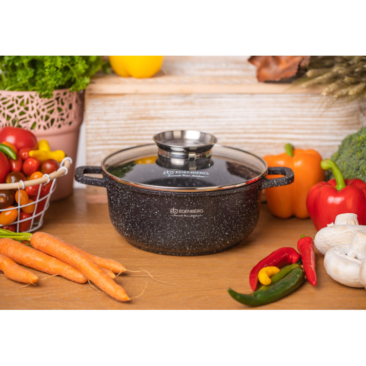Garnek z marmurową powłoką kamienną, która jest twarda, odporna na ścieranie i uniemożliwia przywieranie przygotowywanym potrawom. Powłoka która nie wchodzi w reakcje z żywnością gwarantuje najwyższą jakość posiłków. Szklana pokrywka z dozownikiem przypraw płynnych w zestawie. Spraw by Twój dom wypełnił się aromatem najwyższej jakości potraw.