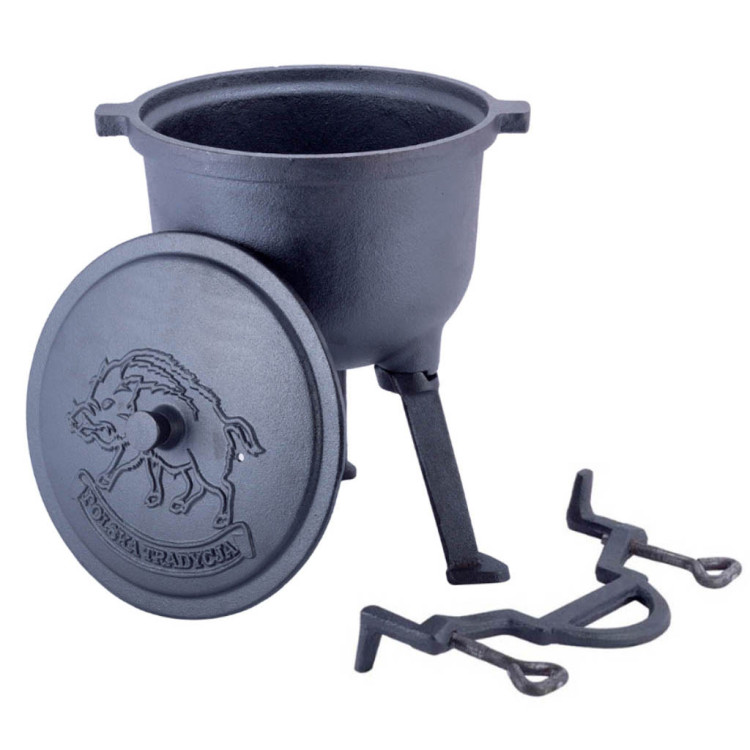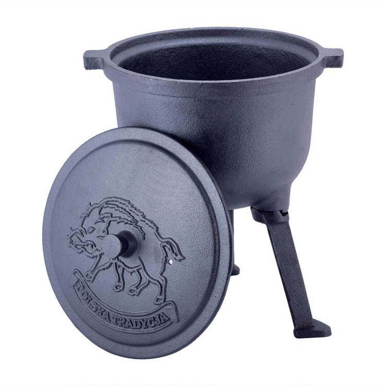 Kociołek myśliwski o pojemności 10 L w zestawie z pokrywką, wykonany z wysokiej jakości żeliwa, które bardzo szybko się nagrzewa i na długo utrzymuje wysoką temperaturę. Garnek posiada solidne mocowanie pokrywki, które służy jako uchwyt do przenoszenia kociołka. Możemy wykorzystać je do zawieszania go nad paleniskiem. Dania przyrządzone w kociołku mają swój niepowtarzalny smak i aromat. Spraw przyjemność sobie i swoim bliskim, kup żeliwny kociołek myśliwski.
