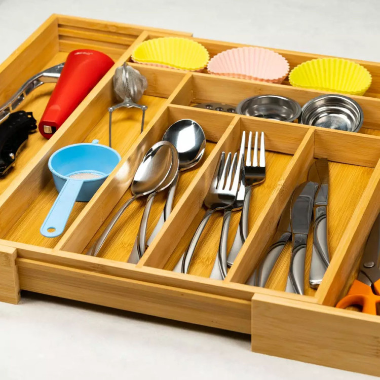 Rozsuwany wkład bambusowy do szuflady na sztućce, przybory kuchenne i narzędzia. Organizer wykonany jest z naturalnego drewna bambusowego odpornego na zabrudzenia i nie pochłania wilgoci. Skrzynka drewniana jest łatwa w czyszczeniu, dzięki niej w szufladzie zapanuje porządek.