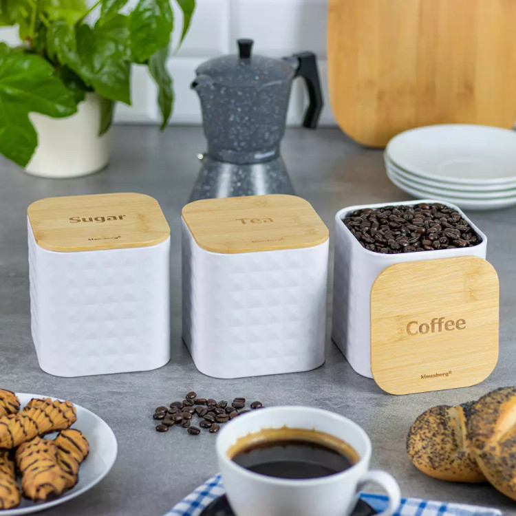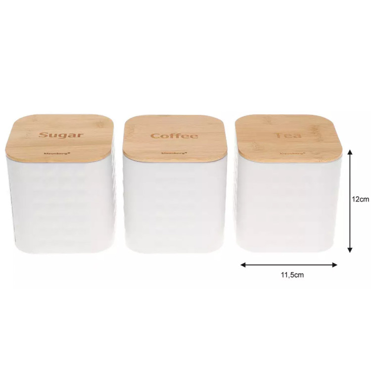 Zestaw 3 pojemników do przechowywania herbaty, kawy oraz cukru. Pojemniki są wykonane z wysokiej jakości stali nierdzewnej z modnym tłoczeniem. Każdy pojemnik posiada drewnianą pokrywkę z uszczelką, dzięki czemu do pojemnika nie dostaje się powietrze i kawa czy herbata nie wietrzeje. Kup je już dzisiaj! Niech ład i porządek zapanuje w Twojej kuchni!