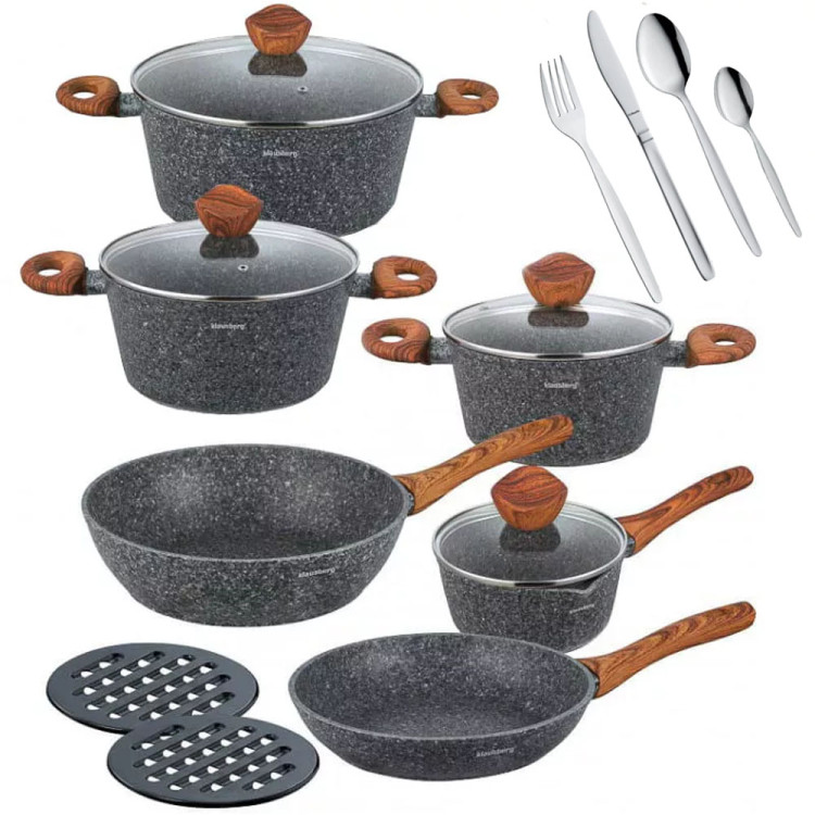 Bogaty zestaw garnków marmurowych Klausberg KB-7242 potrafi podkreślić styl Twojej wyjątkowej kuchni. Ta 12-elementowa kompozycja najbardziej przydatnych garnków, rondla oraz patelni i podkładek jest świetną propozycją do codziennego gotowania w ekskluzywnym stylu. Nowoczesna prosta forma, granitowa powłoka zapewniająca trwałość i estetyczne uchwyty imitujące eleganckie drewno sprawdzą się również w roli wyszukanego kompletu na prezent. Zestaw nadaje się na każdy rodzaj kuchenek, umożliwia przyrządzanie posiłków z minimalną ilością tłuszczu. Dodatkowo jako gratis dodawany jest 24-elementowy komplet sztućców.