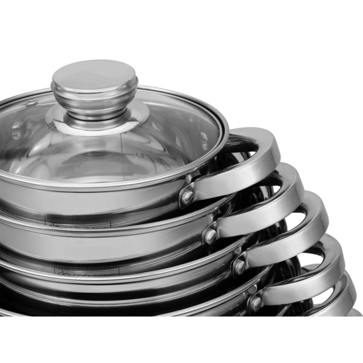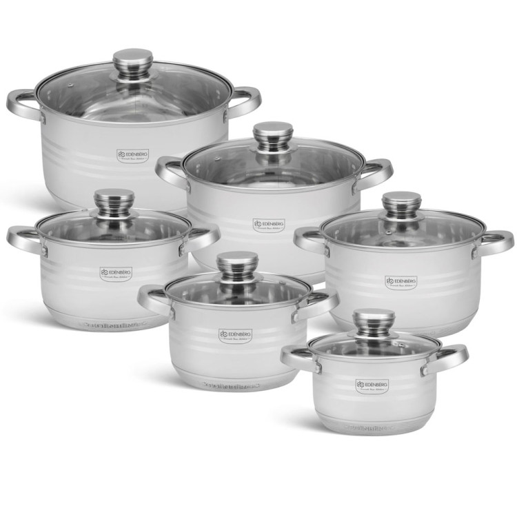 Zestaw solidnych 12 częściowych naczyń wykonany ze stali chromowo-niklowej wraz z pokrywkami z odpowietrznikiem. 6 garnków posiada wielowarstwowe indukcyjne dna, które oszczędzają energię. Garnki stalowe łatwo się myje.